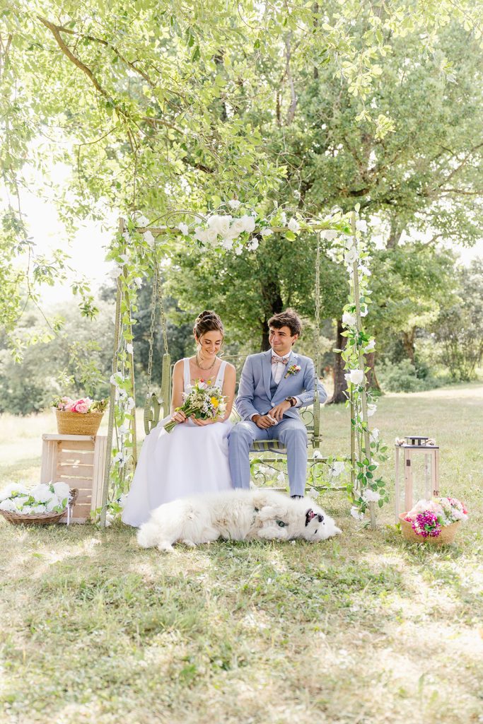 La cérémonie laïque a été imaginée et menée par leurs proches, rendant ce moment encore plus intime et personnel. Leur fidèle compagnon à quatre pattes a eu un rôle bien particulier : c’est lui qui a apporté les alliances, provoquant sourires et larmes d’émotion.